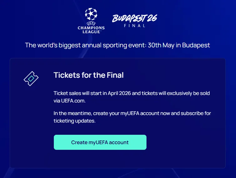 注:以上价格为参考2025年决赛票务方案的预测价格,2026年官方价格将于4月公布。建议现在注册myUEFA账户并订阅票务通知,以便第一时间获取最新信息。
