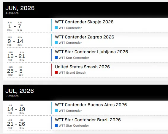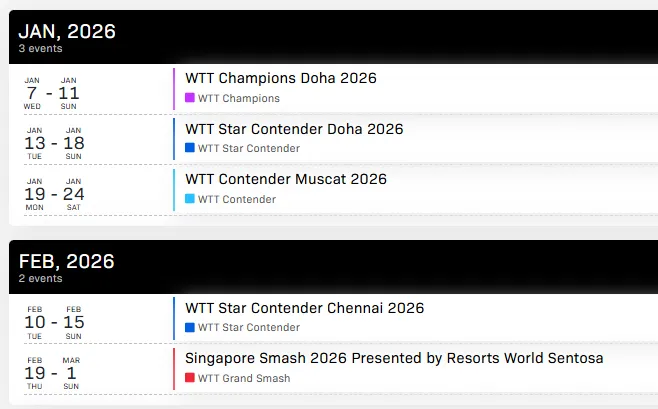 • WTT冠军赛多哈站(1月7日-11日)• 新加坡大满贯(2月19日-3月1日)• 中国大满贯(10月1日-11日) |